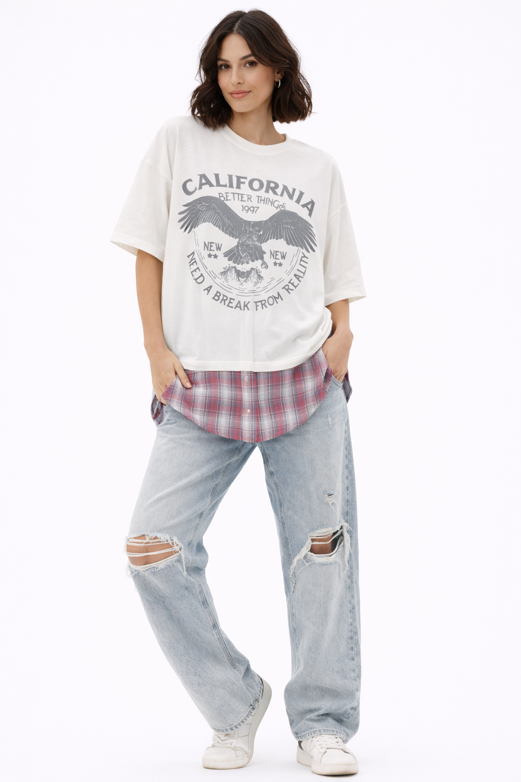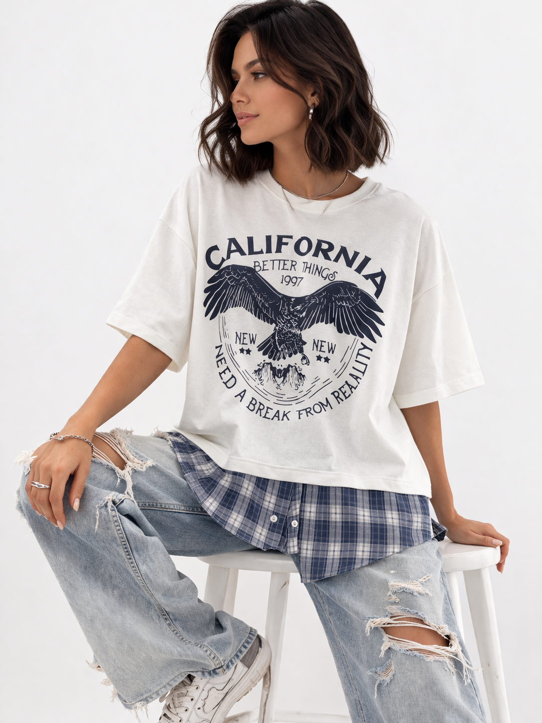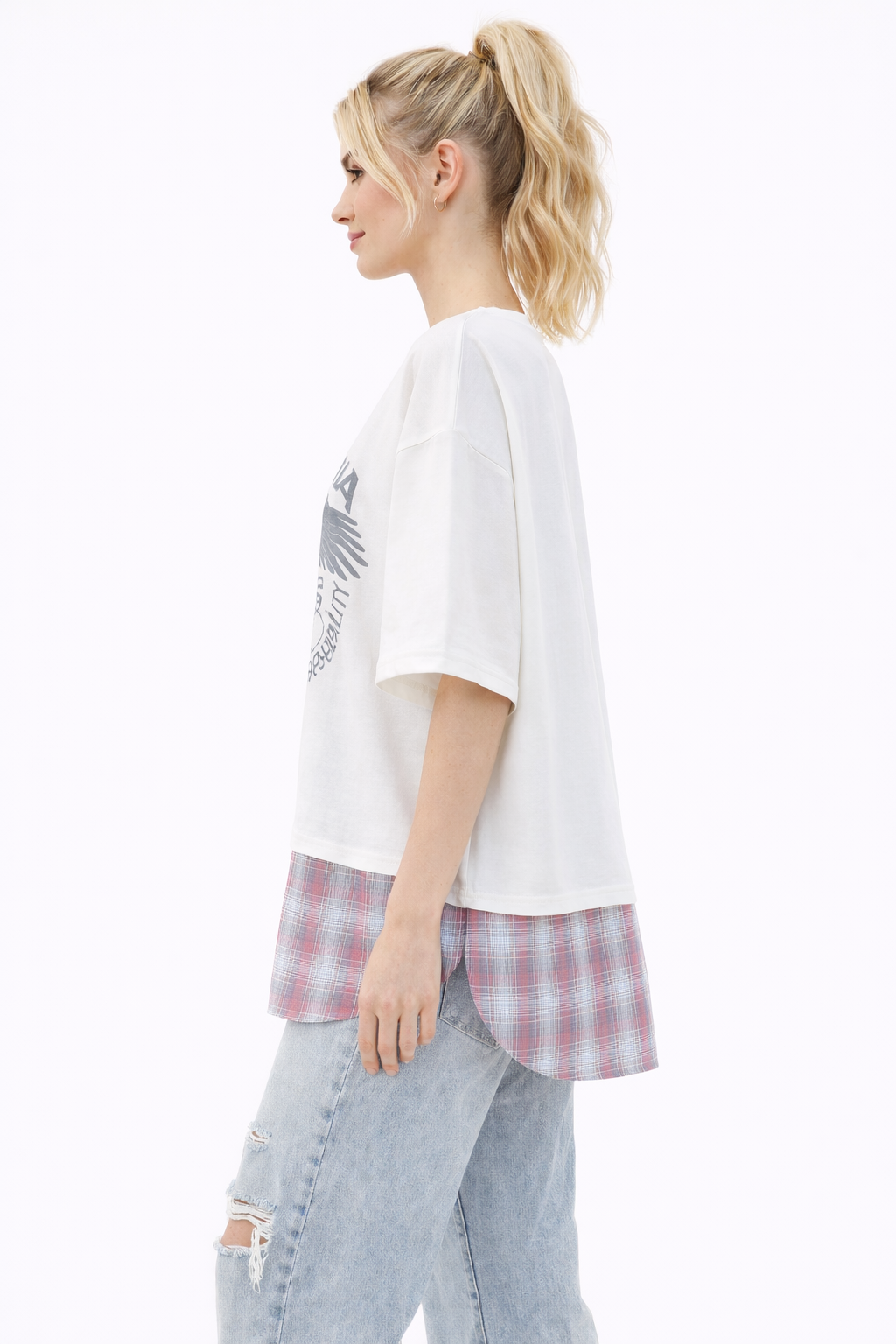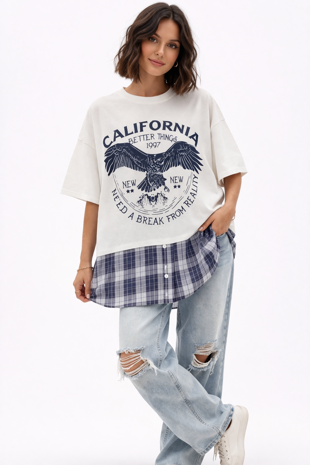 חולצת אוורסייז עם עיצוב משבצות וכפתורים מתחת לחולצה לבנה.