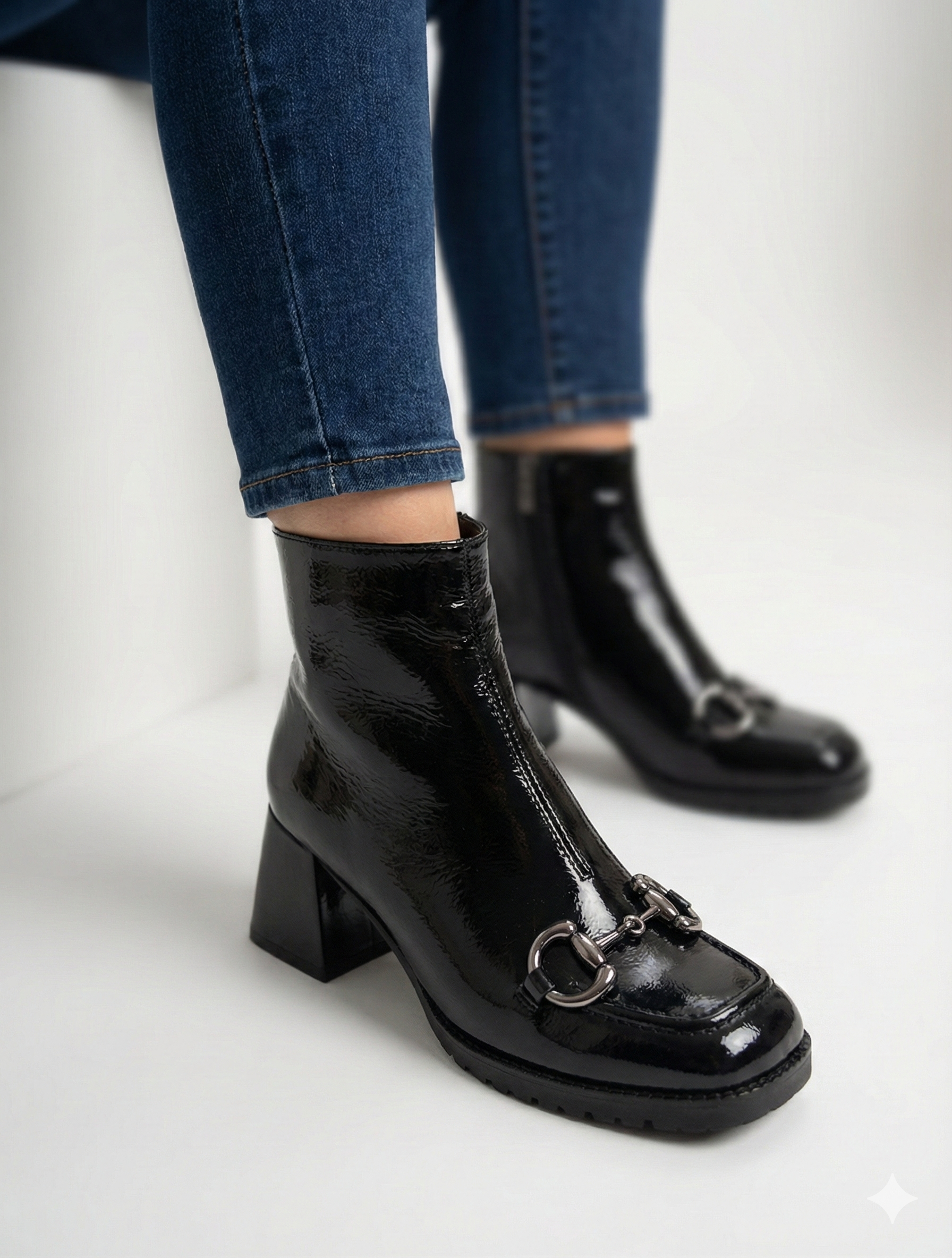 מגפוני עקב בצבע שחור בגימור מבריק, עם אבזם מתכתי עדין בחזית.